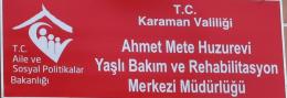 Karaman Aile ve Sosyal Politikalar Ýl Müdürlüðü ve Karaman Huzurevi ve Yaþlý Bakým Rehabilitasyon Merkezi Müdürlüðü yetkilileri, Tesislerin bir dernek oluþturularak inþa edilmesine vesile olan ve yakýn bir geçmiþte vefat eden Emekli Hukukçu Ahmet Mete’nin adýný tesislere verilmesini kararlaþtýrdý.
